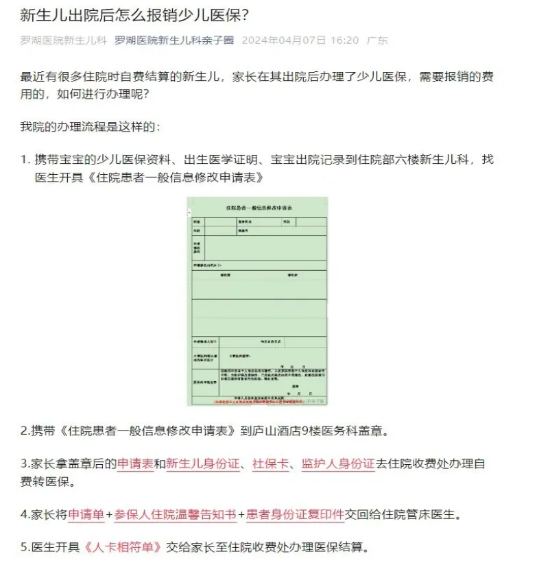 流程繁琐:家长需往返多个地方办理,首先至新生儿科填写《住院患者一般信息修改表》→庐山酒店医务科盖章→住院收费处办理转医保手续→交资料回新生儿科→医生开具《人卡相符单》→家长至住院收费用医保结算