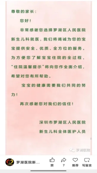 面对每位前来的家长,医护人员都会热情接待、详细宣教新生儿照护知识,并通过微信公众号定期推送科普、办事流程等。此外,科室还开通了视频探视、床边探视等多样化服务,帮助家长消除顾虑、缓解分离焦虑,让每一份牵挂都能得到回应,让医疗服务更有温度。