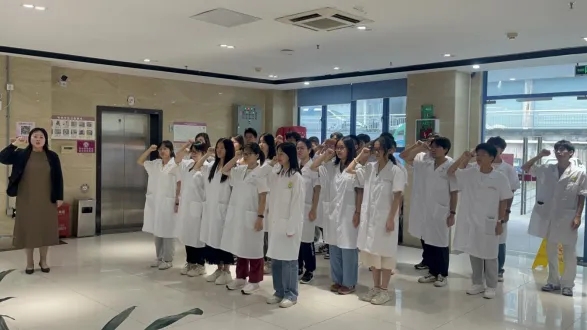 典礼的一个重要环节是医学生宣誓仪式。全体同学在刘宇副院长的带领下,移步至一楼大厅整齐列队,高举右拳,庄严宣读医学生誓言。铮铮誓言回荡在现场,彰显了同学们投身医学事业、守护人民健康的决心。宣誓仪式后,师生共同合影留念,记录这一重要时刻。